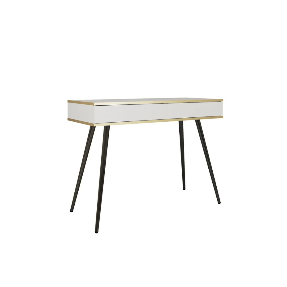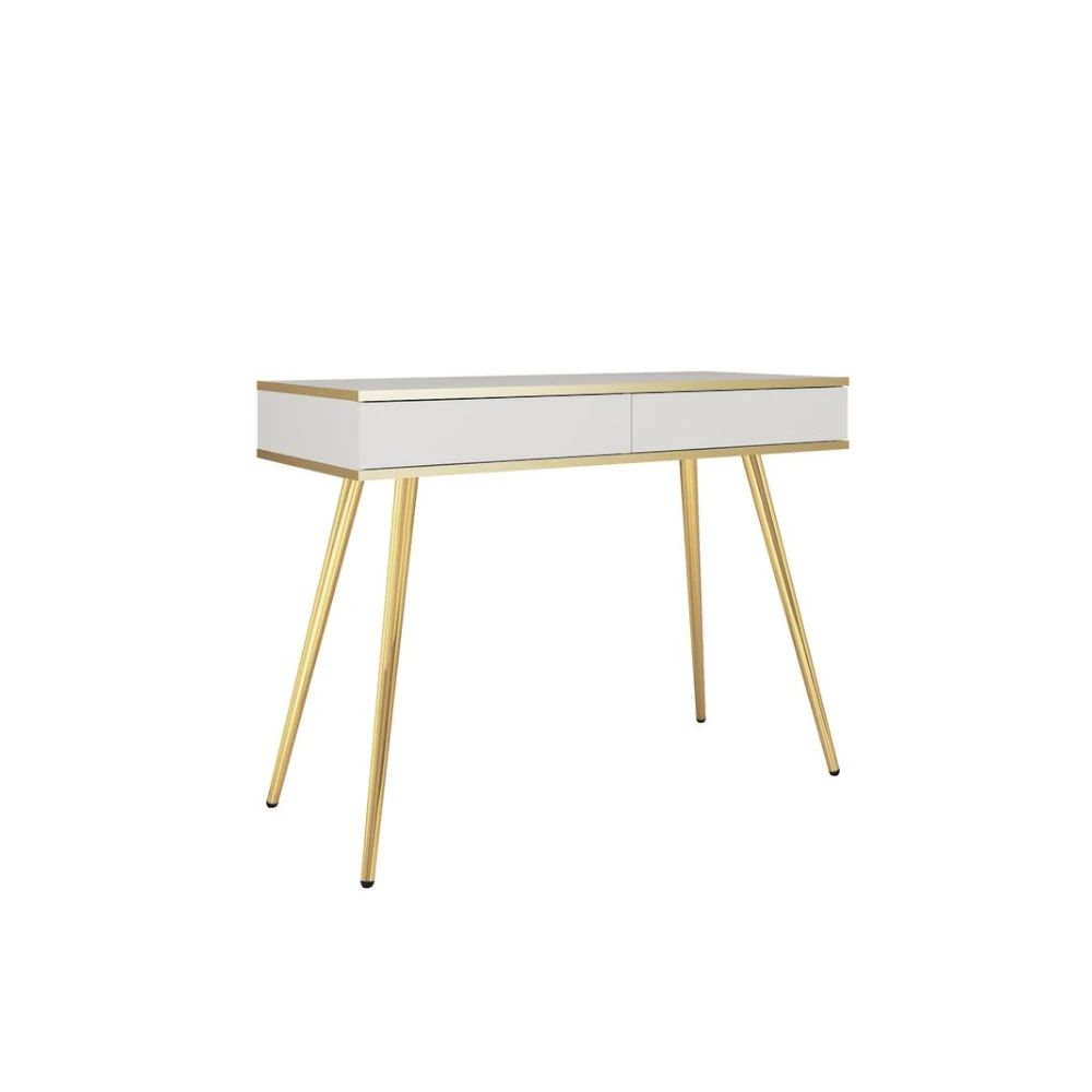 Toaletka Toro z szufladami to elegancki mebel na smukłych nogach, idealny do sypialni lub garderoby. Prosty blat, dwie praktyczne szuflady oraz subtelne złote wykończenie krawędzi tworzą stylowe i funkcjonalne miejsce do makijażu i przechowywania drobiazgów.