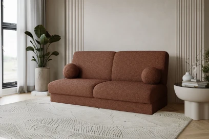 Wersalka Limba bez boczków to kompaktowa sofa z funkcją spania, idealna do nowoczesnego salonu, pokoju gościnnego lub kawalerki. Obita miękką tkaniną boucle Quelle 54 w kolorze karmelowym, zachwyca prostą bryłą i modną strukturą materiału. Dzięki mechanizmowi klik-klak szybko zamienisz ją w wygodne łóżko o powierzchni spania 120x190 cm, a pościel schowasz w praktycznym pojemniku.