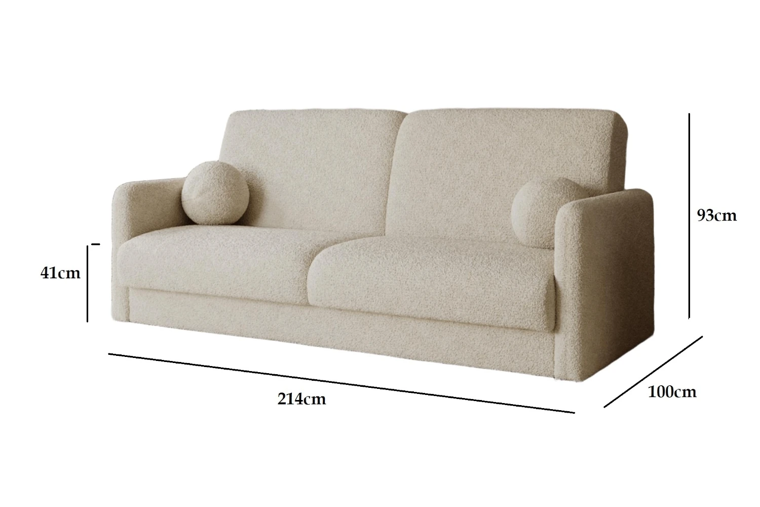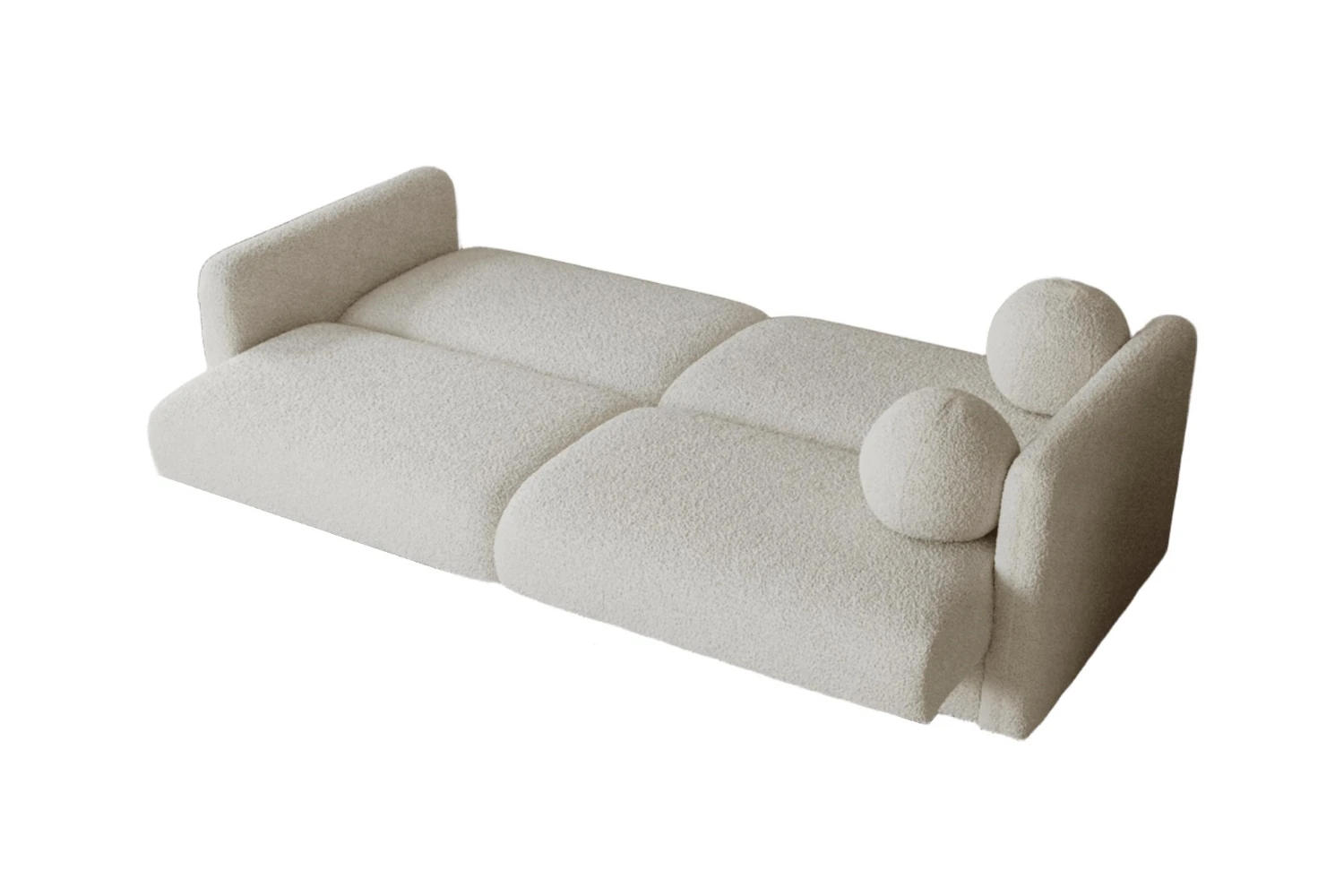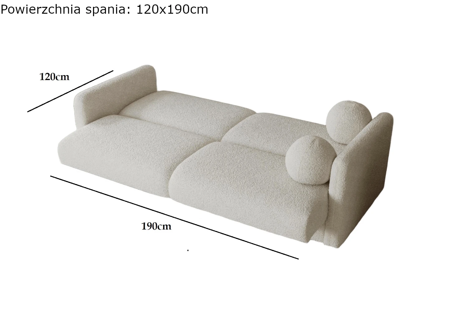 Neutralna kolorystyka i miękka struktura bouclé sprawiają, że wersalka Limba z boczkami doskonale wpisuje się w nowoczesne, skandynawskie i minimalistyczne aranżacje. To praktyczna, estetyczna i funkcjonalna wersalka do salonu z funkcją spania i pojemnikiem na pościel, która sprawdzi się na co dzień i od święta.