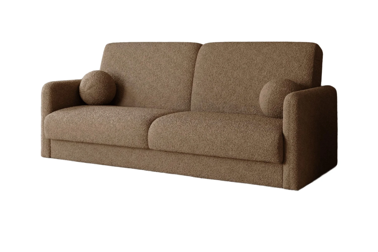 Wersalka Limba z boczkami to wygodna sofa z funkcją spania i pojemnikiem na pościel, tapicerowana przyjemną w dotyku tkaniną bouclé Quelle 18 w odcieniu beżu kawowego. Prosta forma, wysokie oparcie oraz miękkie siedzisko sprawiają, że to idealna wersalka do salonu, pokoju młodzieżowego lub niewielkiej kawalerki.