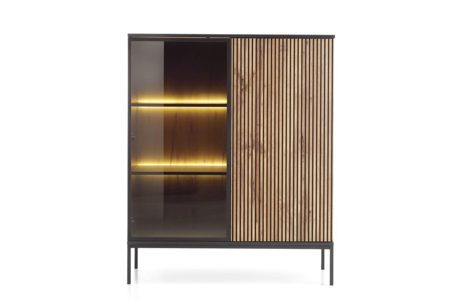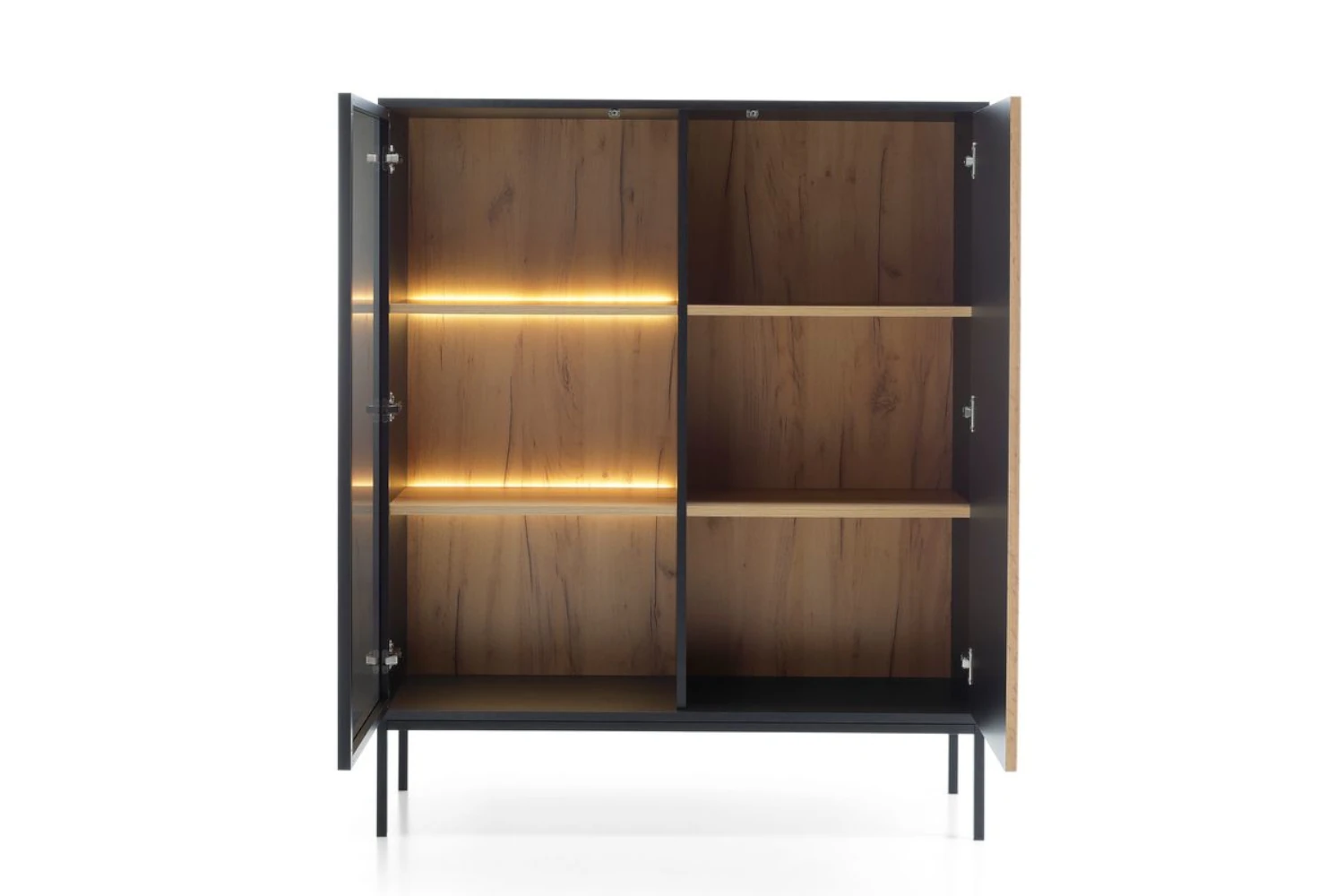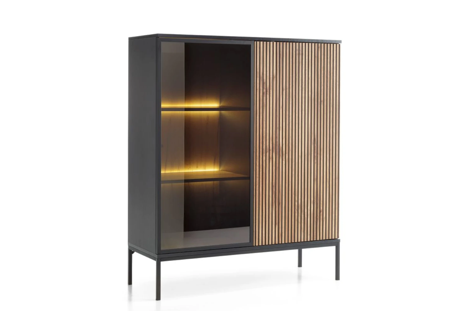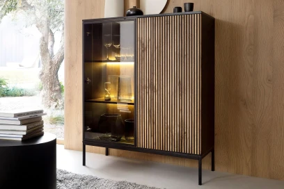 Witryna loftowa niska Linea to idealny wybór do nowoczesnego salonu, jadalni lub pokoju dziennego. Połączenie dekoru dąb Wotan z czarnym korpusem oraz przeszklonym frontem tworzy efektowny, loftowy charakter, a wbudowane oświetlenie LED podkreśla wyeksponowaną zastawę, szkło lub dekoracje.