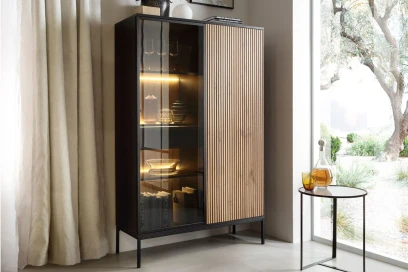 Wysoka witryna Linea to propozycja do nowoczesnych i loftowych salonów, jadalni oraz domowych gabinetów. Połączenie ciepłego dekoru dąb Wotan z głęboką czernią korpusu oraz smukłymi, metalowymi nogami tworzy lekki, efektowny mebel, który nie przytłacza wnętrza, a jednocześnie stanowi wyrazistą dekorację