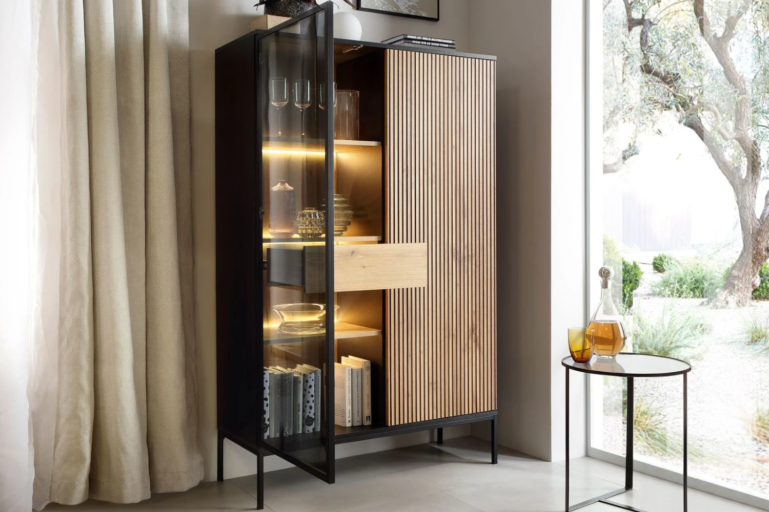 Witryna loftowa Linea to wysoka, stojąca szafka z oświetleniem LED, w której ciepły dekor dąb Wotan łączy się z elegancką czernią. Przeszklona część z podświetlanymi półkami pięknie eksponuje szkło i dekoracje, a frezowany front oraz system push-to-open podkreślają nowoczesny, minimalistyczny charakter mebla.