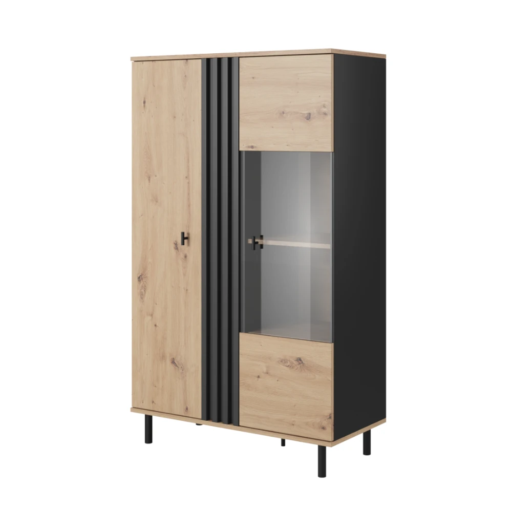 Witryna przeszklona z drzwiczkami Axel dąb Artisan to nowoczesny i pojemny mebel do salonu lub jadalni. Łączy funkcję eleganckiej ekspozycji szkła i dekoracji z praktycznym przechowywaniem, dzięki połączeniu przeszklonych frontów, ryflowanego panelu i zamykanych półek.