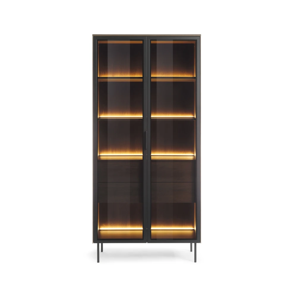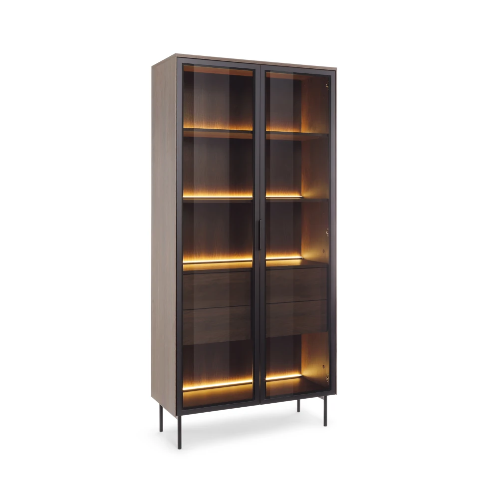 Witryna wysoka z szufladami i oświetleniem LED Nokta Dąb Dunin to elegancki mebel do salonu lub jadalni, który eksponuje zastawę i dekoracje w ciepłym świetle. Przeszklone fronty z brązową szybą antisol, metalowe czarne nogi oraz korpus w dekorze dębu Dunin tworzą nowoczesny, lekko loftowy charakter, a dwie pojemne szuflady z pełnym wysuwem ułatwiają przechowywanie drobiazgów.