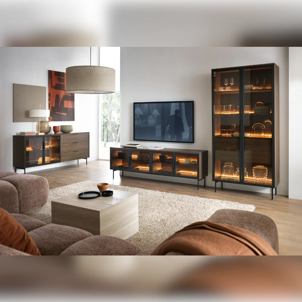 Mebel łączy loftową lekkość z funkcjonalnością. Korpus wykonany jest z płyty wiórowej laminowanej E05 z listwą MDF na bokach, w kolorze dąb Dunin. Fronty tworzy ramka MDF z hartowaną szybą brązowy antisol w czarnej oprawie, co nadaje całości nowoczesny, wyrazisty charakter. Smukłe, metalowe czarne nogi o wysokości 18 cm optycznie wysmuklają bryłę i ułatwiają utrzymanie porządku pod meblem.
