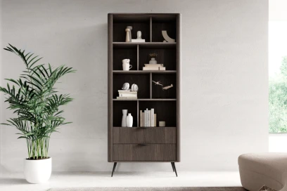 Wysoki regał z szufladami Teris Dąb Dunin to elegancki, pojemny mebel do salonu lub gabinetu, który pomieści książki, dekoracje i dokumenty, a jednocześnie doda wnętrzu przytulnego, nowoczesnego charakteru.