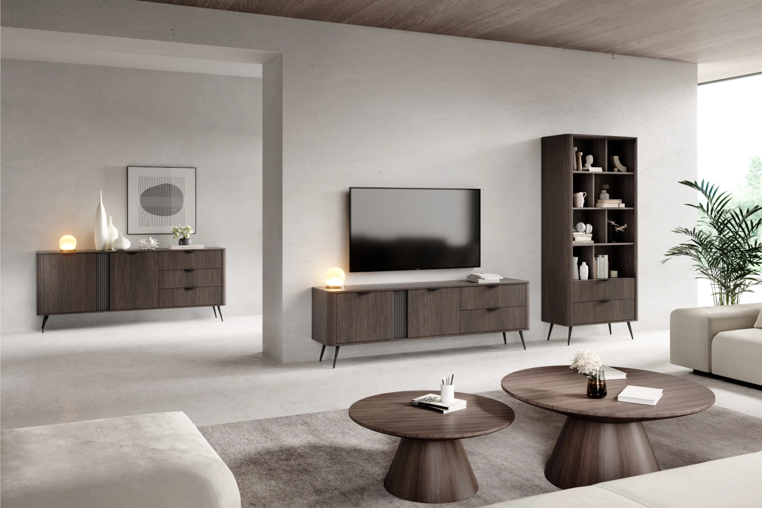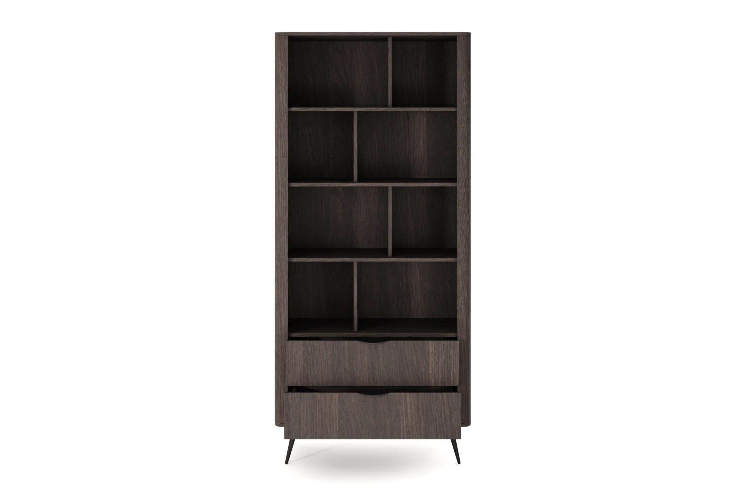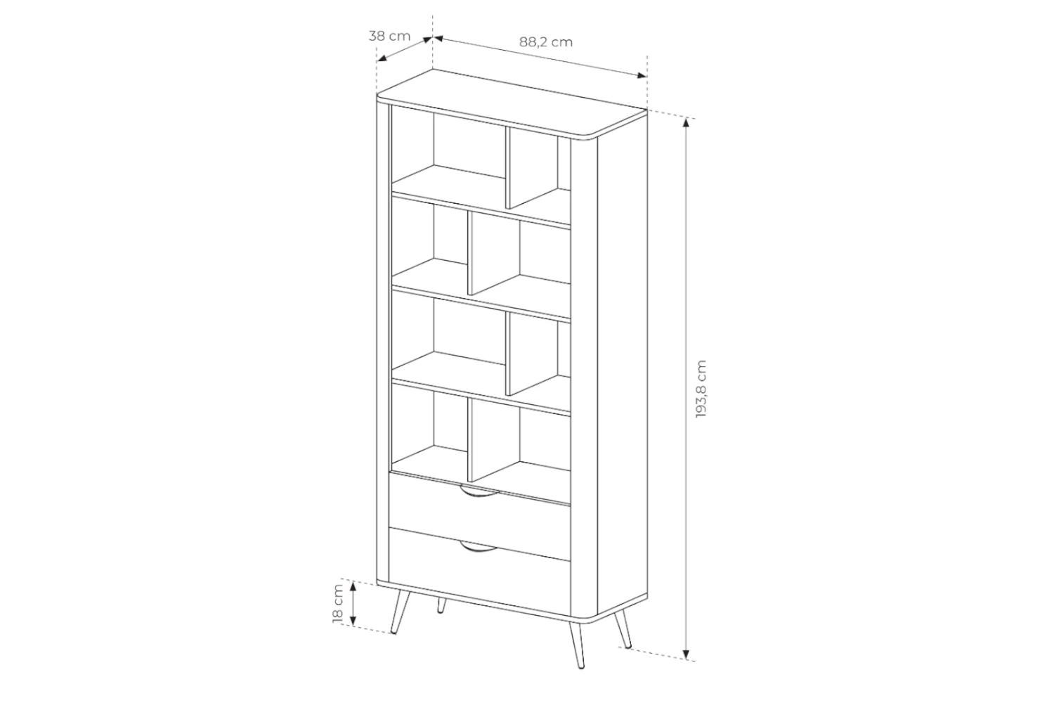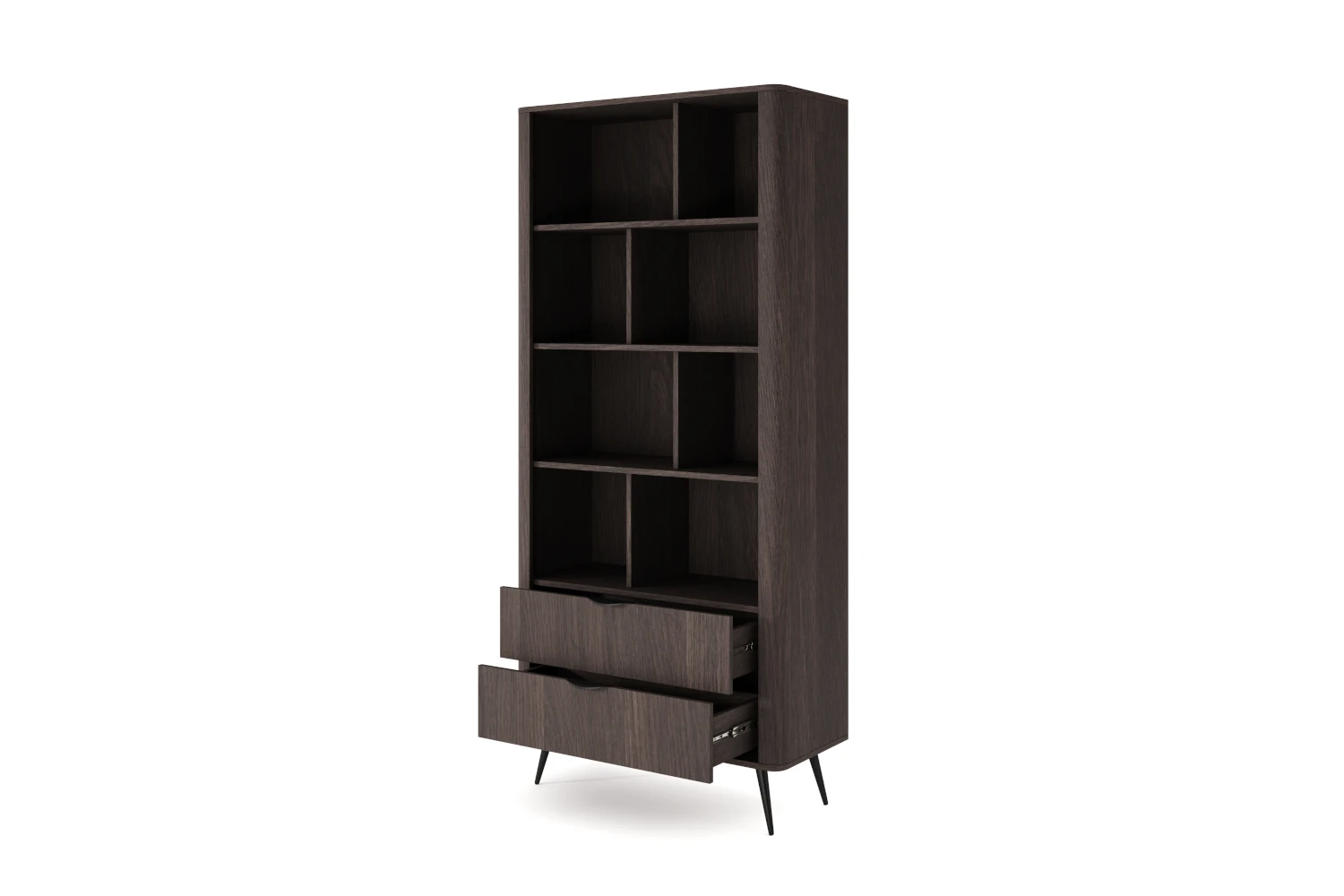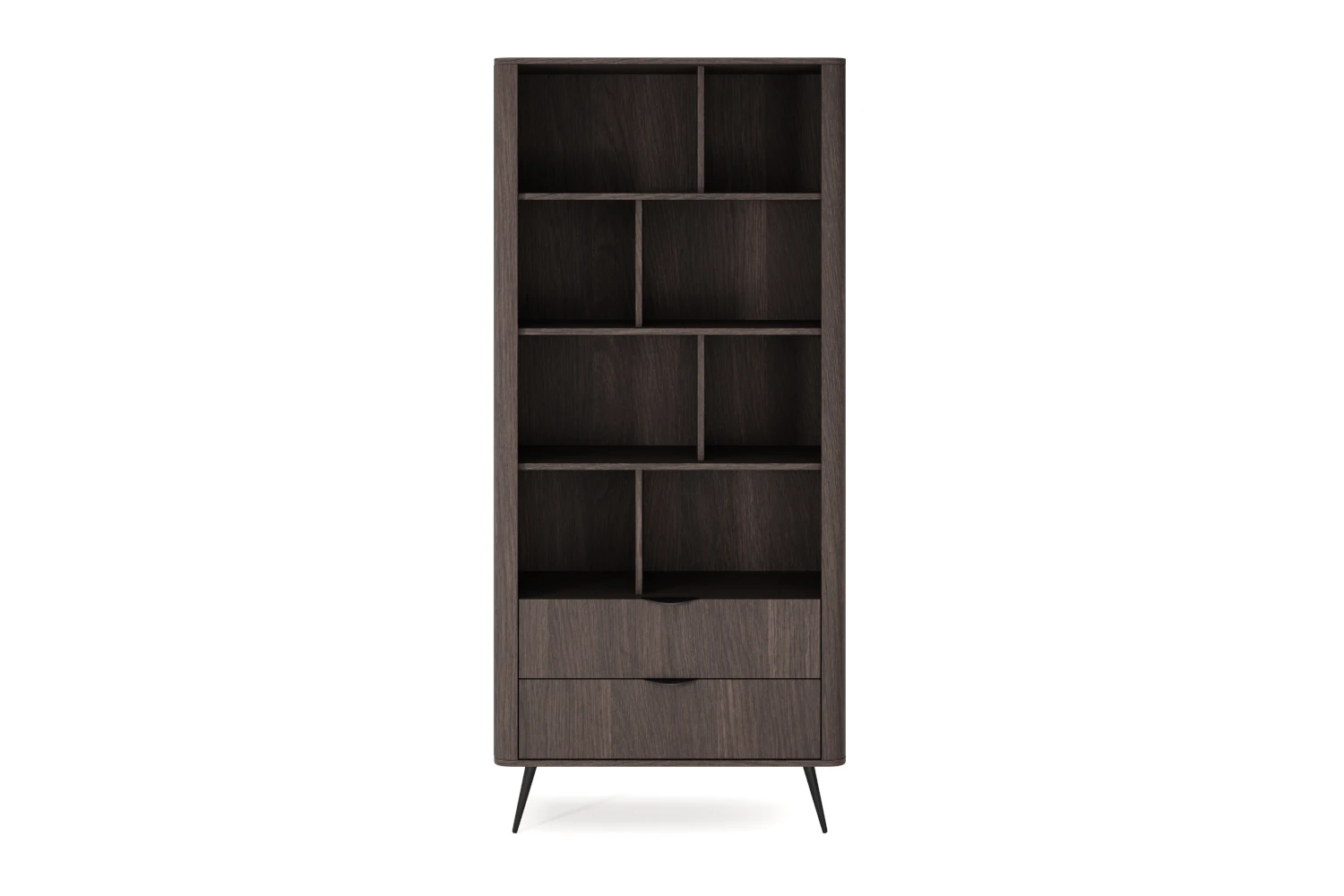 Naturalny odcień dębu Dunin i smukłe, czarne nogi podkreślają nowoczesny, lekki wygląd regału. Zaoblone boki i ryflowane detale dodają mu przytulności, dzięki czemu mebel dobrze odnajdzie się zarówno we wnętrzach minimalistycznych, jak i bardziej przytulnych aranżacjach.